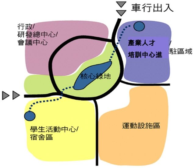 /會議中心區域、產業人才培訓中心區域、學員及研究人員活動與宿舍區、運動設施區等。