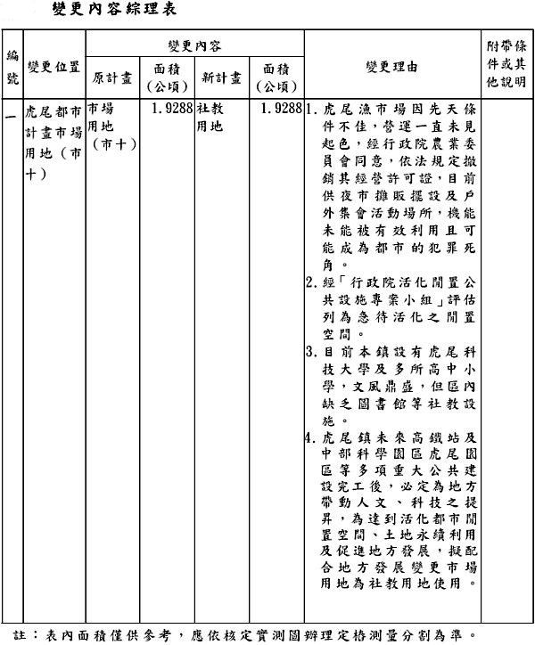 本變更計畫位於虎尾鎮公所東側,目前土地使用分區屬市場用地(市十),變更計畫內容及面積如下: