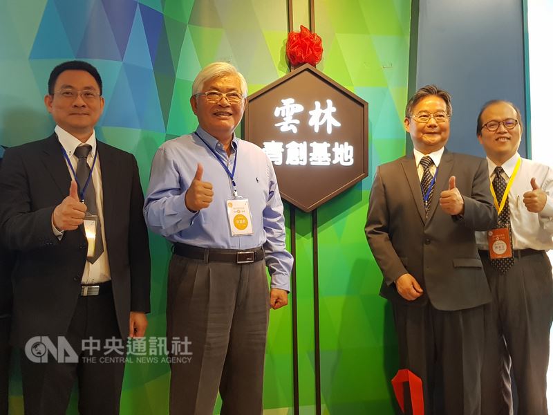雲林首座青創基地23日在虎尾科大揭牌,縣長李進勇(左2)期許雲林官學合作平台,扮演縣府智庫角色,以此後盾協助青年創業,發展智慧科技。中央社記者葉子綱攝107年4月23日