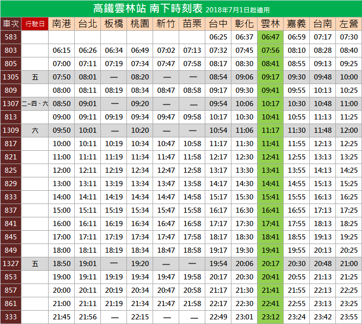 <font color="#ffcc99" size="2">2018-0701起之高鐵雲林站時刻表</font><br /> <!--more--> 北上新增一班【1328】(日),南下新增一班【1305】(五)<div> 半直達車原停靠【板橋】的班次改停靠【桃園】</div><div><br /><div><img height="632" hspace="2" src="https://3.bp.blogspot.com/-V53ArPEpT9Y/Wxnme9b1UqI/AAAAAAAAJIQ/L5P4CNSTnIo5CIHtxKgeoJU9h66l7sK_wCLcBGAs/s1600/202.png" width="707" /><div><br /></div><div><br /></div><div><br /></div><div><img height="632" hspace="2" src="https://3.bp.blogspot.com/-D2zBOzsJl4I/WxnmewMgHNI/AAAAAAAAJIM/TK3L1rAhdEM4ReWC13NHwAEDDwPRMhqDQCLcBGAs/s1600/201.png" width="707" /></div></div></div>