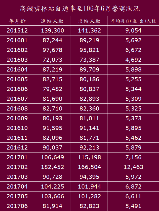 高鐵雲林站通車以來至106年6月份營運情況(人數)